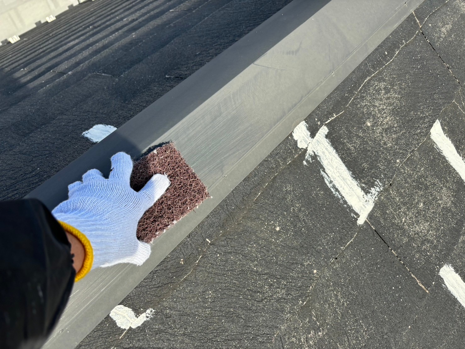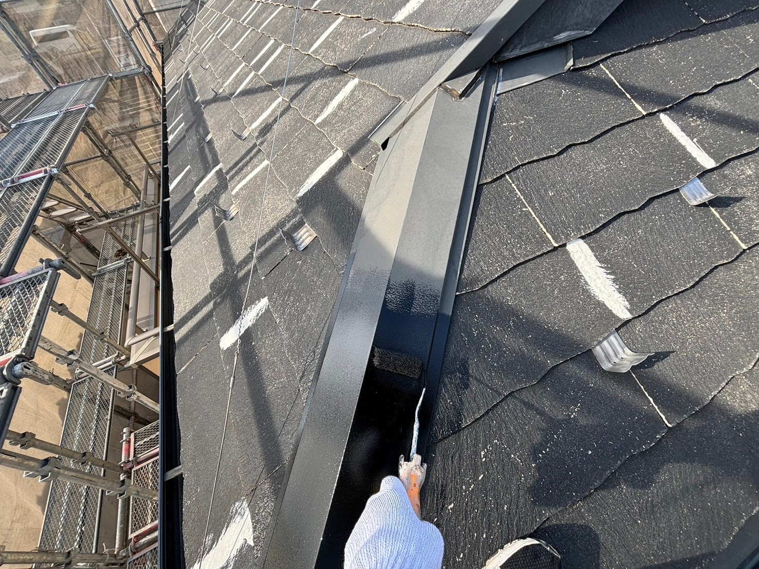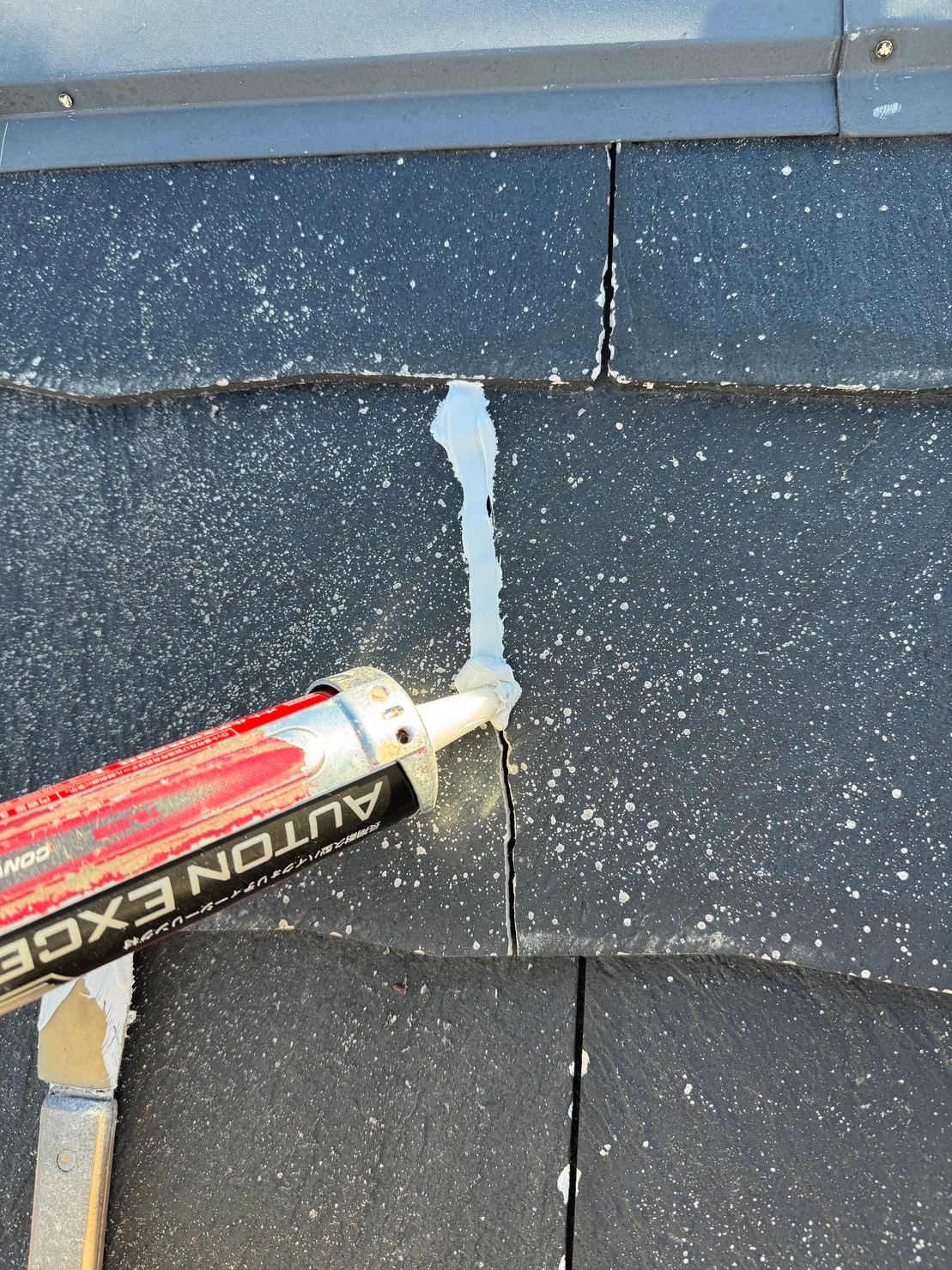 ↑まず最初に、屋根塗装に入る前にヒビ割れの補修をしていきます。