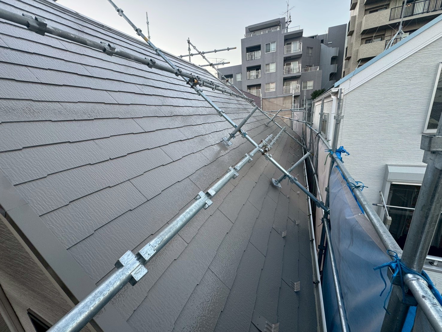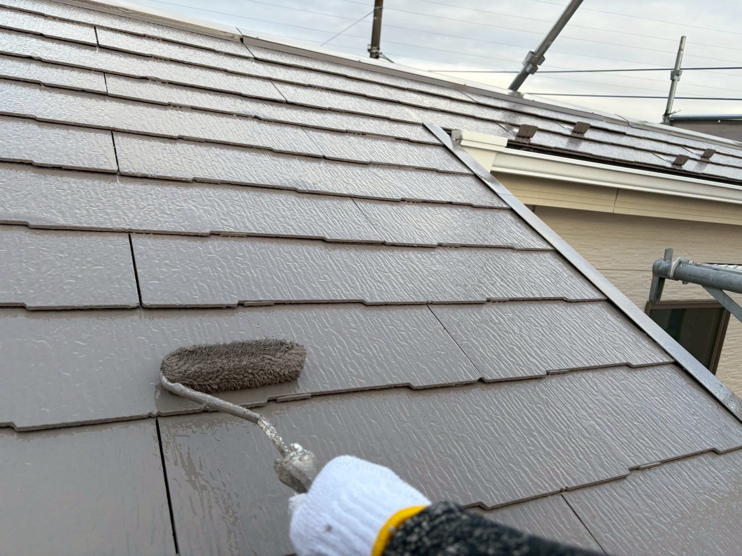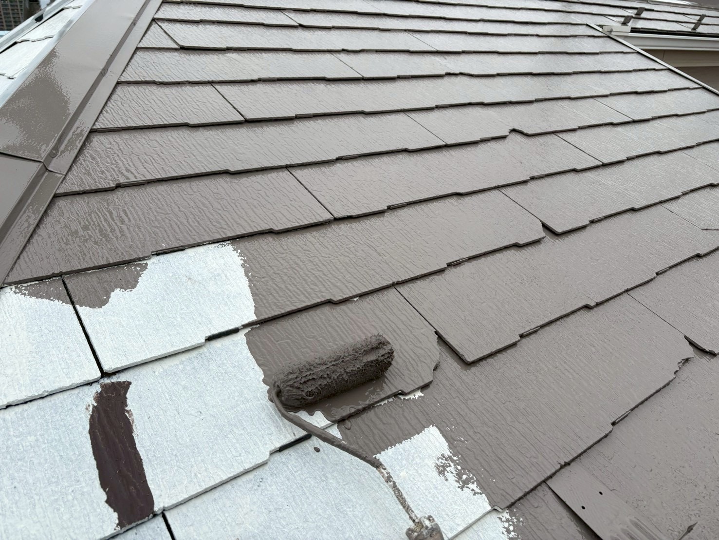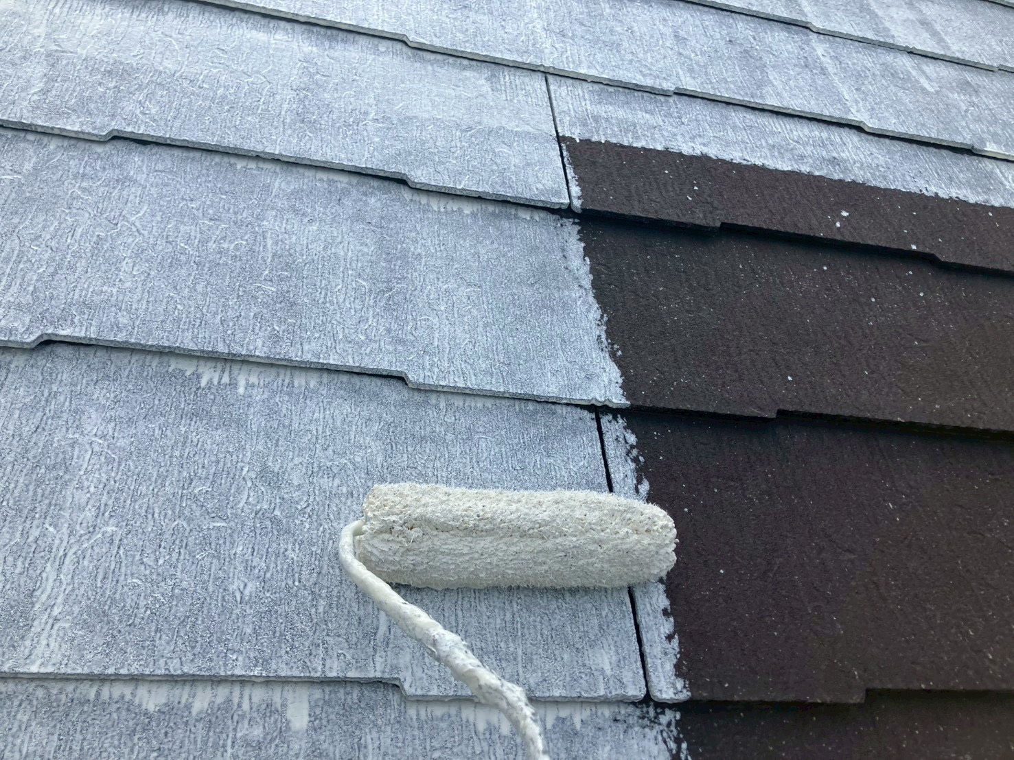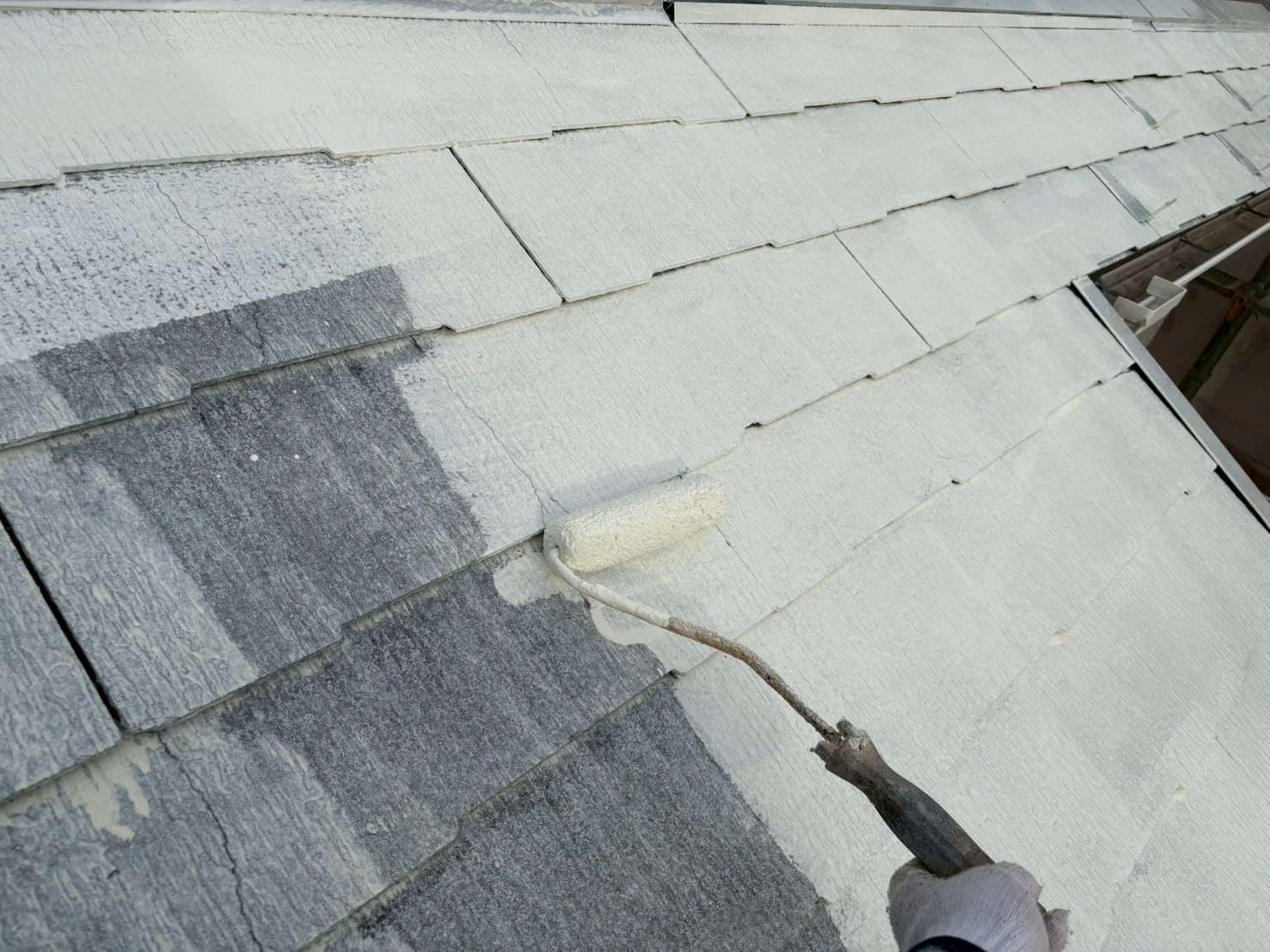 • 「屋根塗装の下塗り作業中です。サーモアイシーラーでしっかりと密着性を高めます。※1枚目:下塗り1回目 2枚目:下塗り2回目」