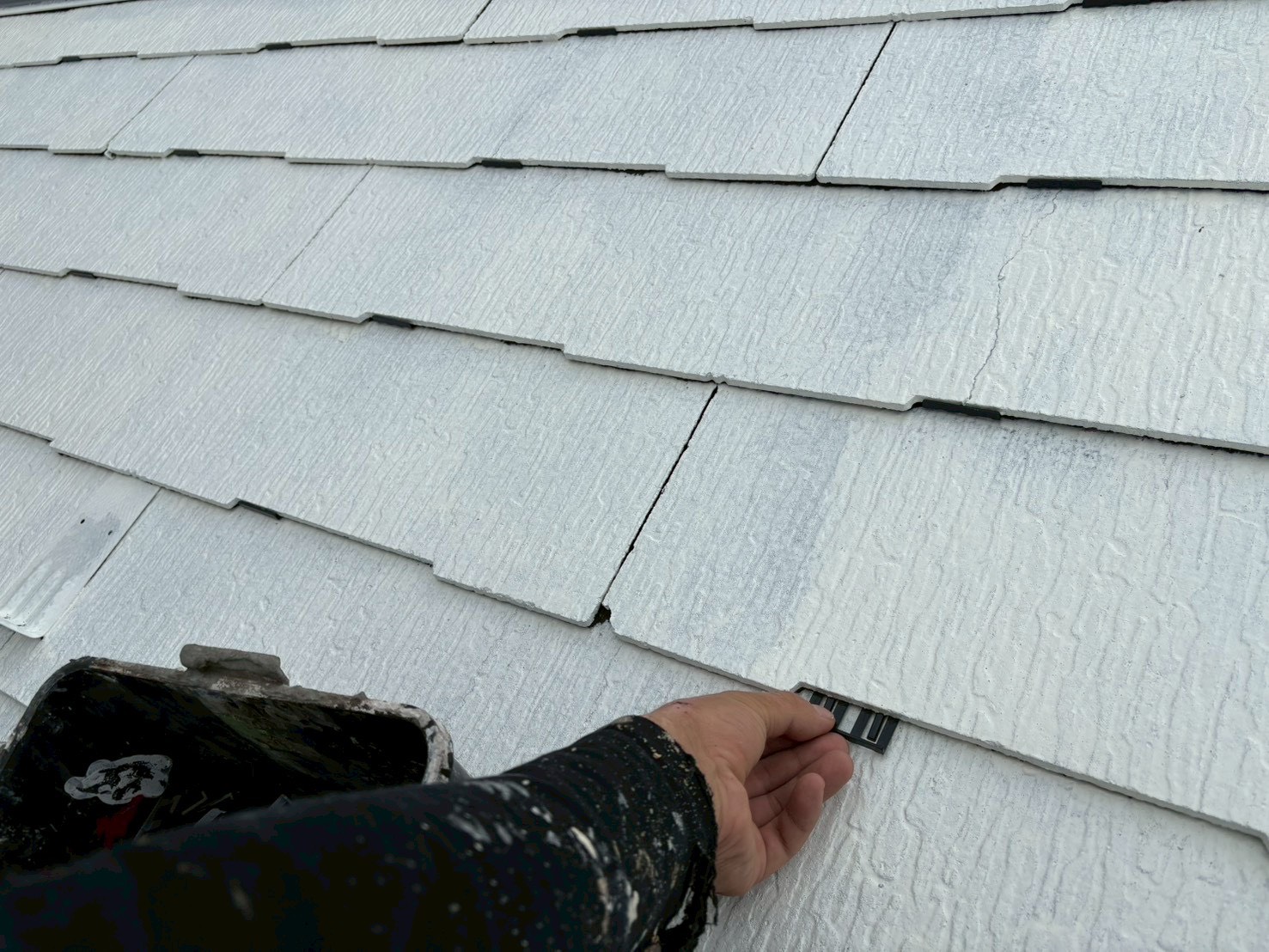 下塗り作業が完了した後は、スレート瓦の重なり部分にタスペーサーを挿入しました。これにより雨水の排水経路を確保し、