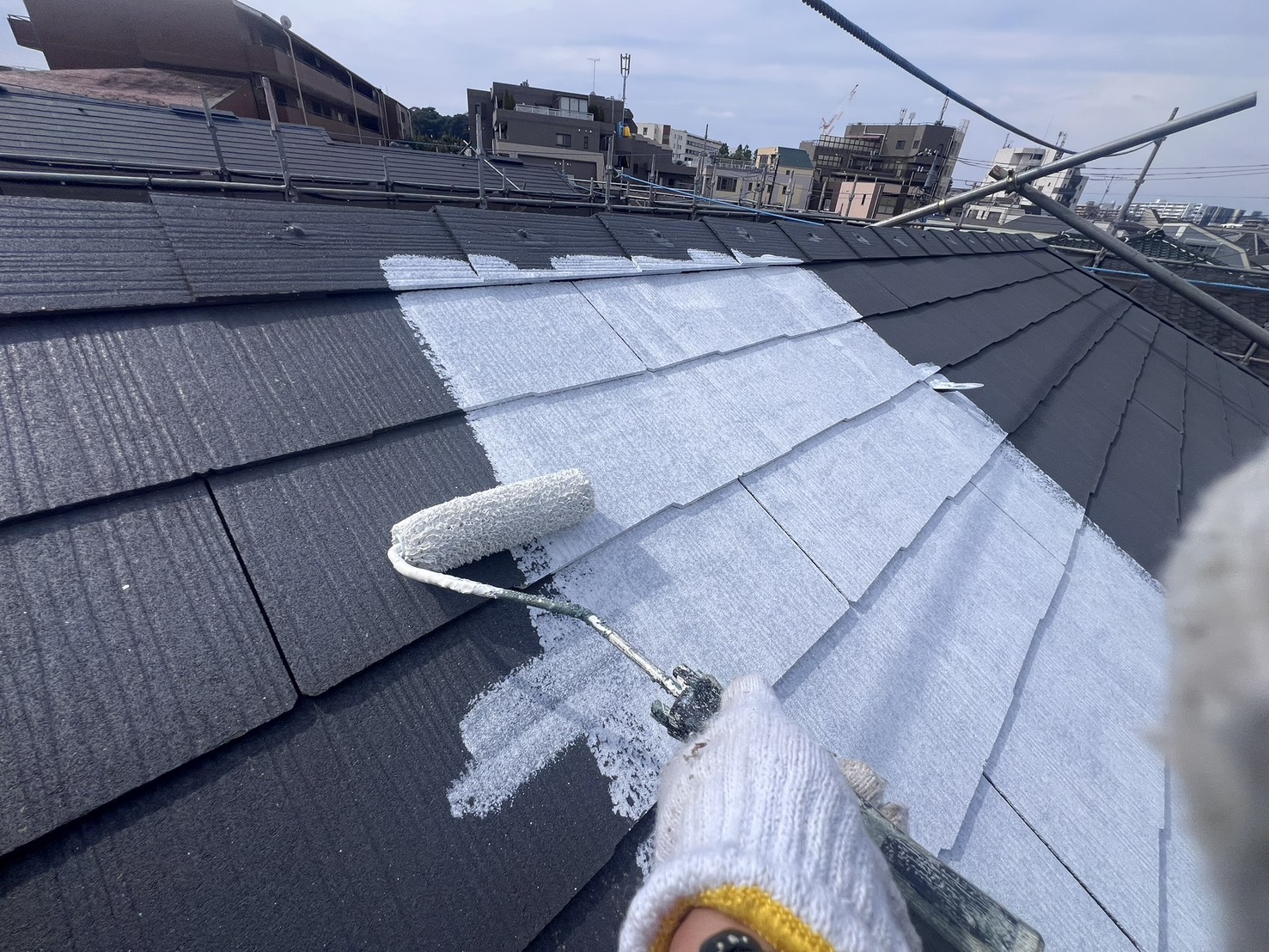 2. 中塗り作業中 — エスケークールタイトSiを丁寧に塗布し、遮熱効果を高めていきます。