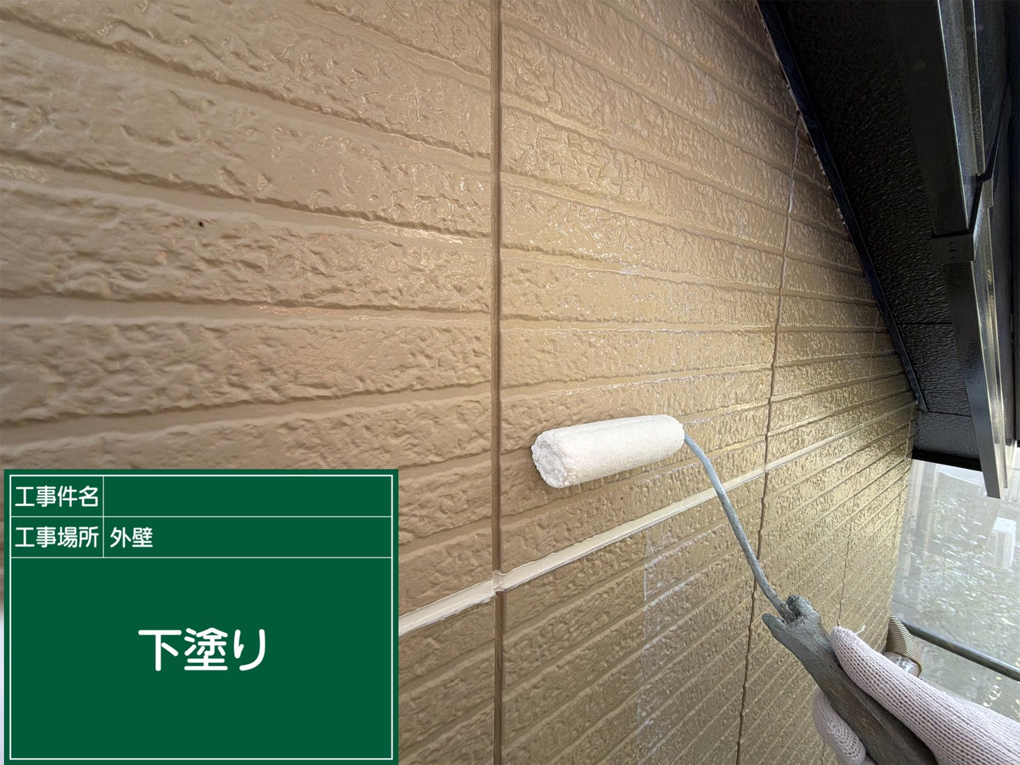 まず外壁の密着性を高めるために、下塗り材のミラクシーラーを全面に塗布しました。